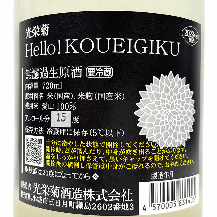 Product Name: Hello! Koueigiku Aiyama Nigori Muroka Nama Genshu Grade: Junmai Daiginjo Polishing Rate: 50% Rice Type: Aiyama Alcohol: 15% Vol Brewery Prefecture: Saga, Koueigiku Shuzo