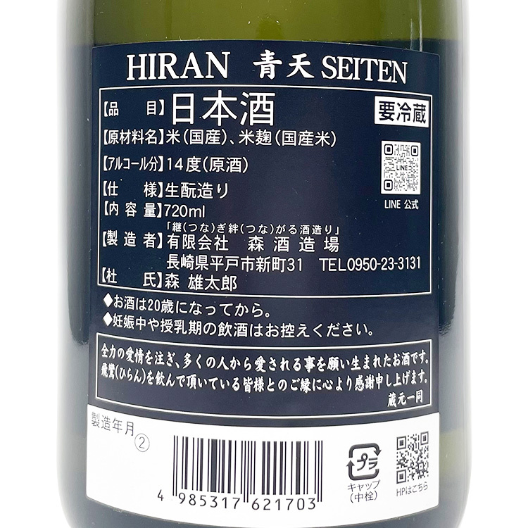 Product Name: Hiran Seiten Junmai Kimoto Muroka Genshu Grade: Junmai Polishing Rate: 60% Rice Type: Koji rice: Yamada Nishiki, Hanging rice: Asahi Mai Alcohol: 14%Vol Brewery Prefecture: Nagasaki Morishuzojo Co., Ltd.